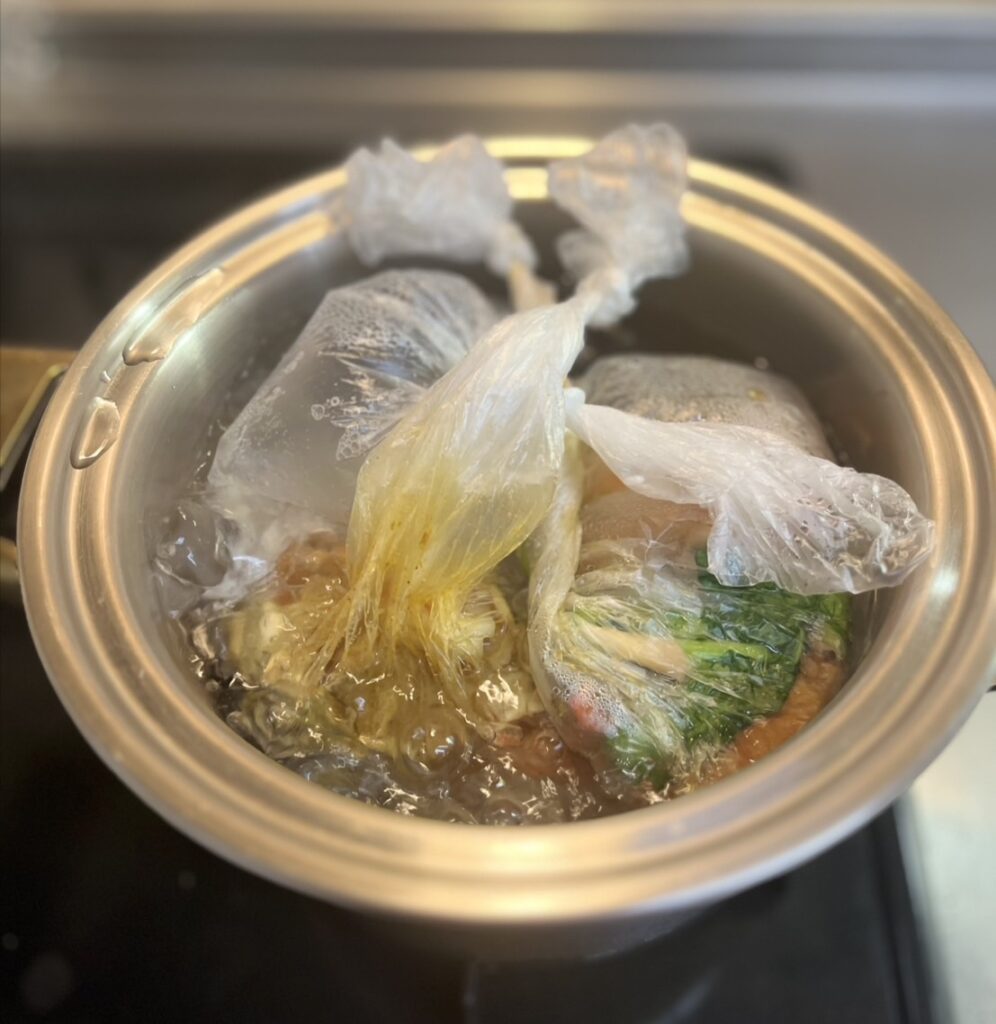 今回はいつもの調理方法とは違う、お湯を沸かした鍋とポリ袋で作る、パッククッキングをメインに行いました(^^)/